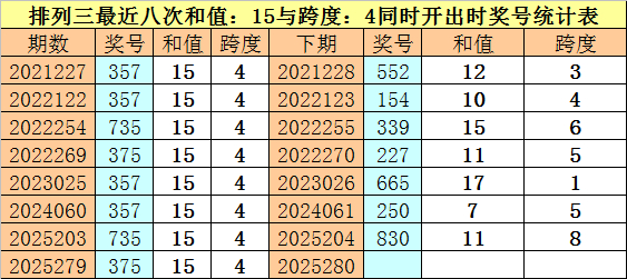 体彩排列三最近八次同时出现和值:15与跨度:4的奖号分别为:357、357、735、375、357、357、735、375,前七次下期开出奖号分别为:552、154、339、227、665、250、830,详见下表: