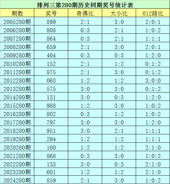 排列三第2025280期开奖日期:2025年10月21日,历史上第280期已开出了20次奖号,历年同期号码分别为:899、808、864、659、404、152、875、063、575、131、988、802、797、951、294、160、868、133、601、859。