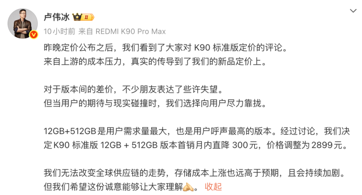 至于为何仅隔一夜就突然降价,卢总给出的回应是:来自上游的成本压力(存储成本上涨),真实的传导到了我们的新品定价上。但当用户的期待与现实碰撞时,我们选择向用户尽力靠拢。