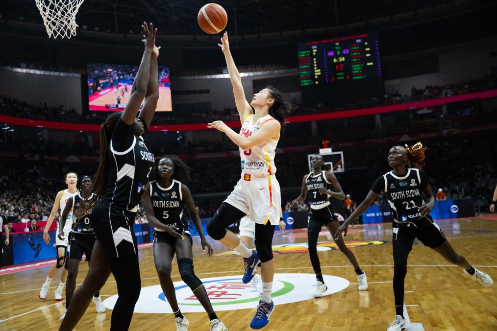 3月14日,中国队球员王思雨(中)在比赛中上篮。当日,在武汉举行的2026年女篮世界杯资格赛A组比赛中,中国队86:76战胜南苏丹队。新华社记者 肖艺九 摄