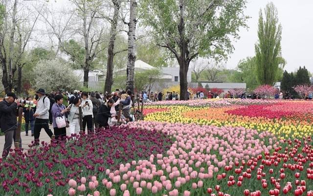 国家植物园(北园)科普馆西侧8000平方米郁金香花海迎来盛放。郁金香、风信子、洋水仙、蓝壶花等100余个品种、20余万株球根花卉竞相绽放,打造出“花影织梦——以梦为马 不负韶华”主题景观,为京城春日增添绚丽色彩。